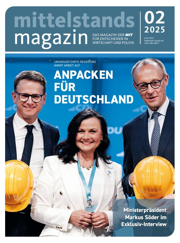 Das neue Mittelstandsmagazin ist da! In dieser Ausgabe geht es um den Start der neuen unionsgeführten Bundesregierung und ihre Neustart-Agenda für unser Land. Außerdem lesen Sie ein exklusives Interview mit dem bayerischen Ministerpräsidenten Dr. Markus Söder über die politischen Anforderungen der nächsten Jahre, den notwendigen Mentalitätswandel in Deutschland und warum die Abgrenzung zu den Grünen notwendig war.