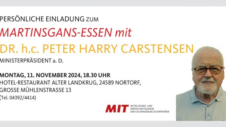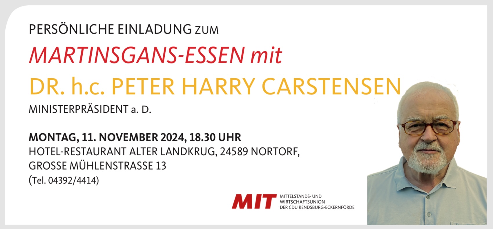 Die Mittelstands- und Wirtschaftsunion (MIT) im Kreis Rendsburg-Eckernförde lädt wieder ein zum traditionellen Martinsgans-Essen mit unserem ehemaligen Ministerpräsidenten und CDU-Landesvorsitzenden Peter Harry Carstensen in das Hotel-Restaurant ALTER LANDKRUG in Nortorf ein.